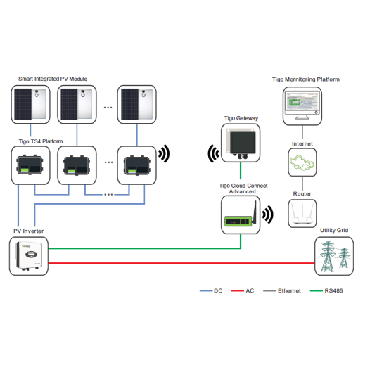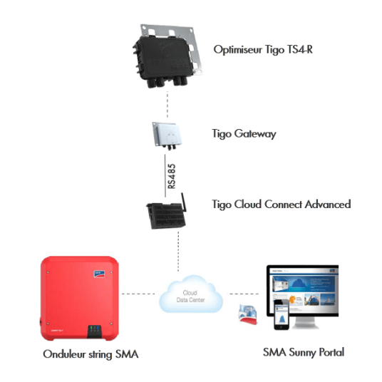 Moduły TS4-R komunikują się z Acces Pointem w sposób bezprzewodowy, Acces Point połączony jest z rejestratorem danych CCA za pomoca przewodu RS485. Rejestrator CCA wyposażony jest w port RS-485 zapewniający zgodność z urządzeniami innych firm. Umożliwia to odczytywanie oraz raportowanie danych z falowników wyposażonych w modbus. Połączenie z falownikami jest możliwe za pomocą łączy RS485 jednak nie jest konieczne, system działa równiż bez podłączenia do falownika.